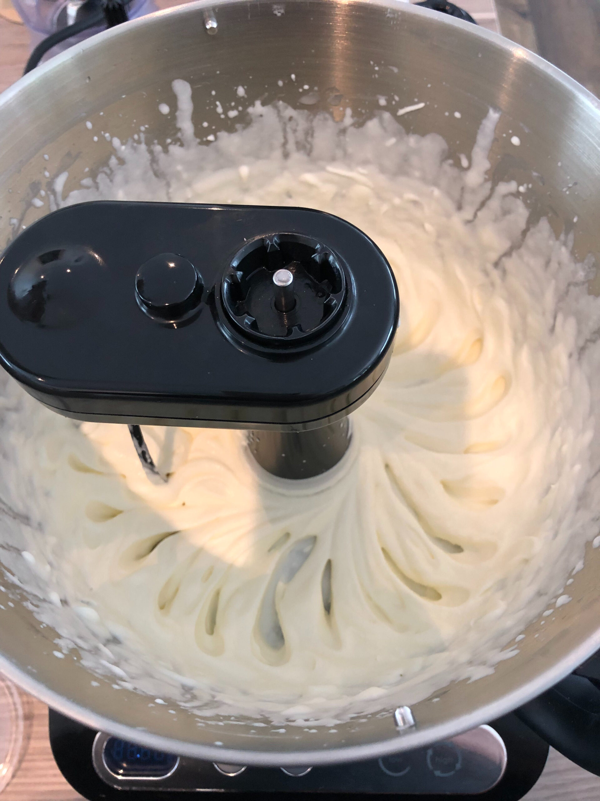 Die Sahne für die süßen Waffeln wurden auch in der Metallschüssel mit dem Schneebesenaufsatz geschlagen.