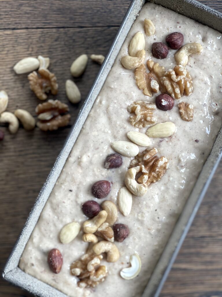 Den Teig in die Kastenform füllen und mit den restlichen Nüssen dekorieren. Ihr könnt auch ein oder zwei längsgeschnittene Scheiben Banane oben drauf legen.