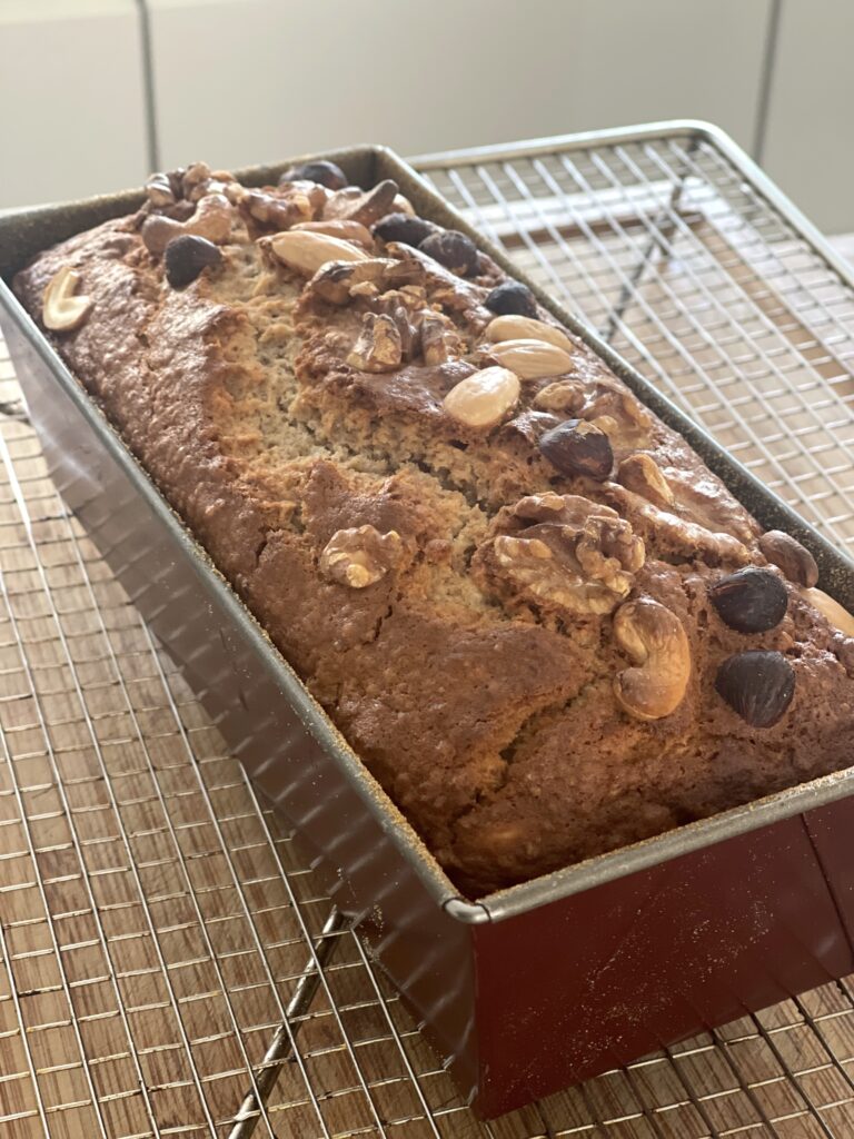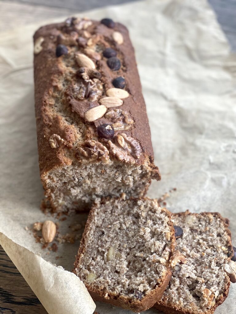 Das Brot muss jetzt für 60 Minuten bei 180°C in den Backofen. Deckt es am besten nach 30 Minuten mit einem Backpapier ab, damit die Nüsse nicht verbrennen und der Teig nicht zu dunkel wird.